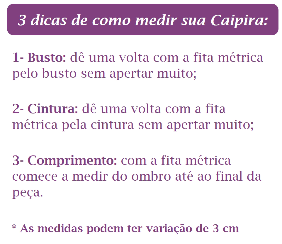 * Não é possível customizar as medidas, pois são padrão e a pronta entrega;