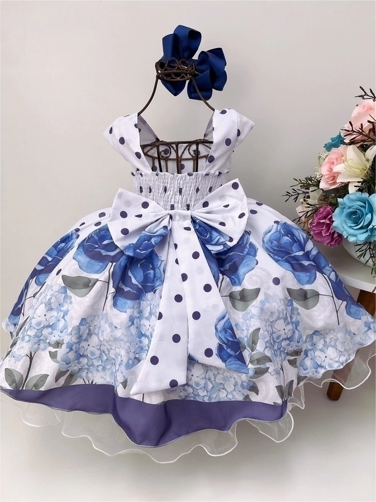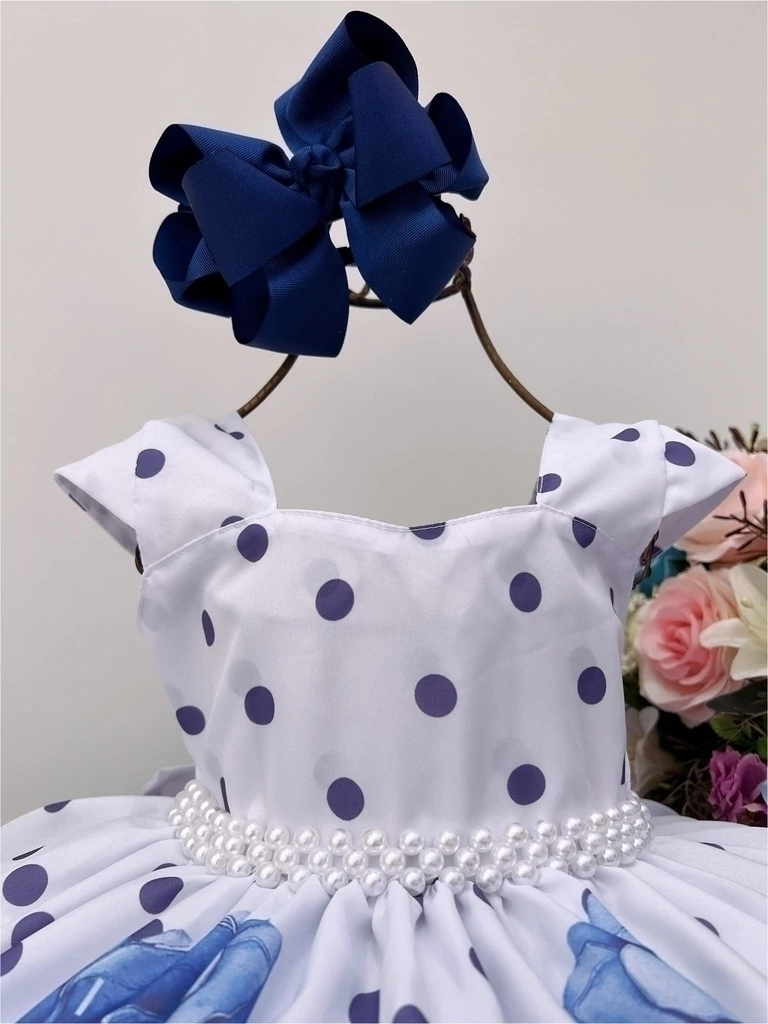 ????? Vestido Infantil Branco Floral Azul com Bolas e Cinto de Pérolas